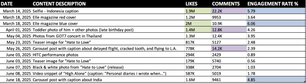 What’s working in terms of views: The meme videos (April 8 & 13) had plenty of views and impressive engagement rates. These posts promote his music that feels very natural, and they did well. His fans obviously loved it!