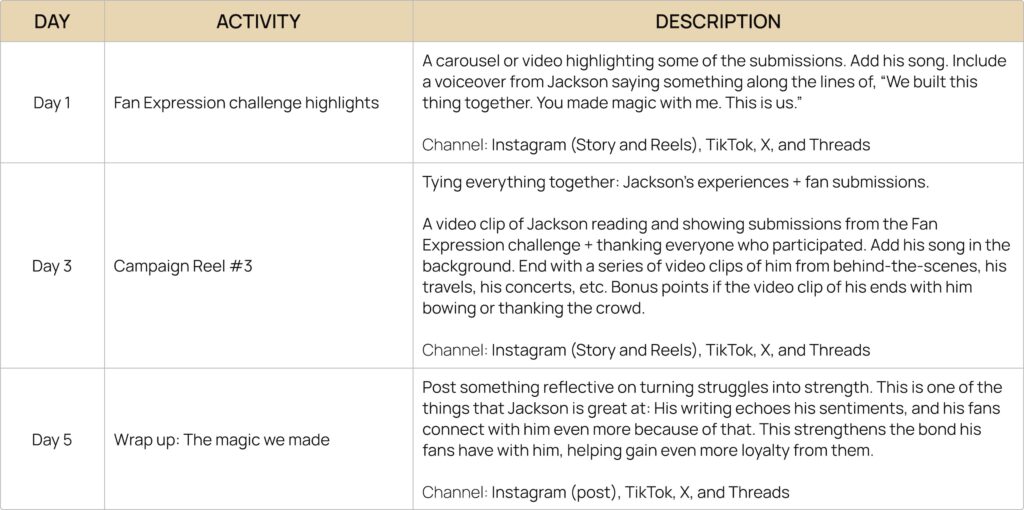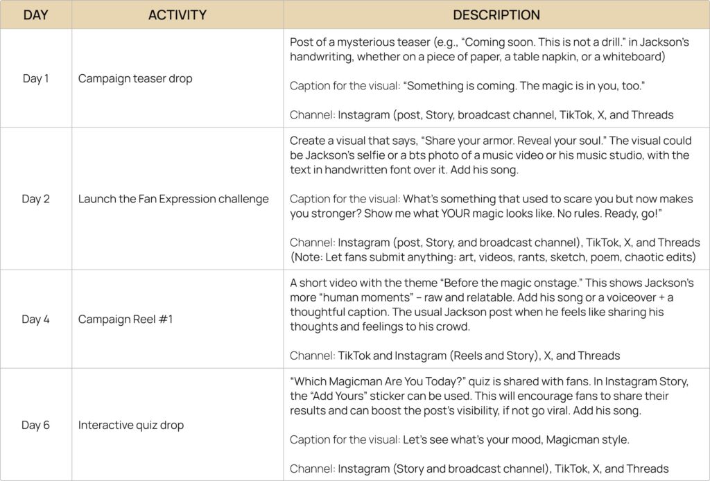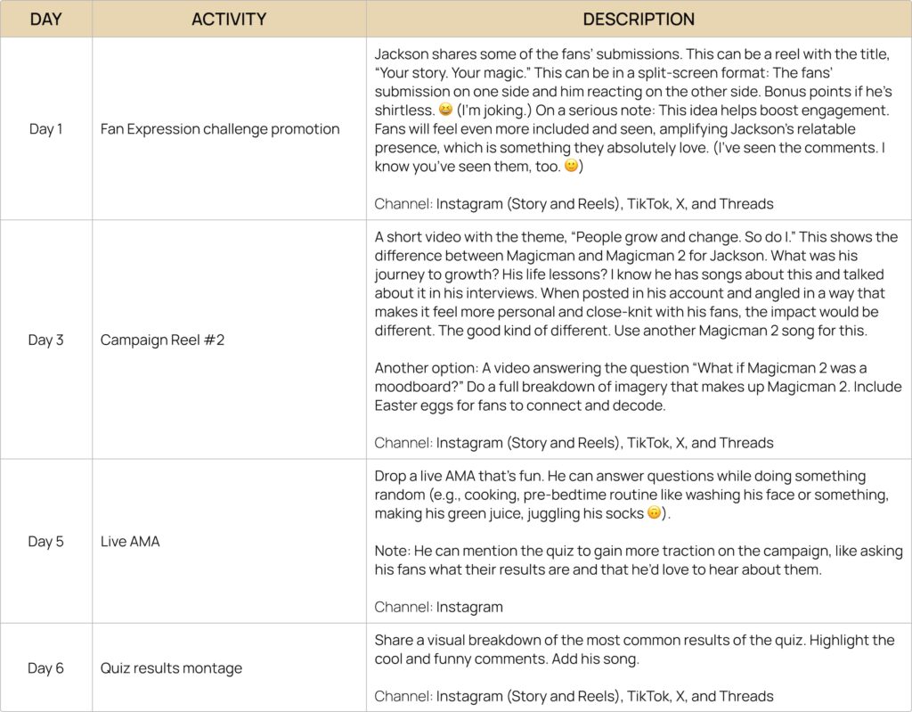 Scroll down and see how the campaign proposal unfolds, week by week, tailored for Jackson and his fans. See how “MAGICMAN 2: Made – This is Us” plays out.
